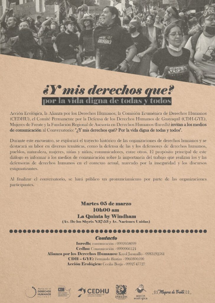 Acción Ecológica, la Alianza por los Derechos Humanos, la Comisión Ecuménica de Derechos Humanos (CEDHU), el Comité Permanente por la Defensa de los Derechos Humanos de Guayaquil (CDH-GYE), Mujeres de Frente y la Fundación Regional de Asesoría en Derechos Humanos (Inredh) invitan a los medios de comunicación al Conversatorio: «¿Y mis derechos qué? Por la […]