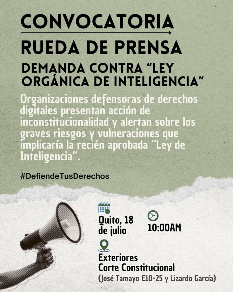 CONVOCATORIA A RUEDA DE PRENSA Organizaciones defensoras de derechos digitales presentan demanda de inconstitucionalidad contra la Ley Orgánica de Inteligencia Este viernes 18 de julio de 2025 organizaciones defensoras de derechos digitales presentarán una acción de inconstitucionalidad en contra de la Ley Orgánica de Inteligencia, que entró en vigor el 11 de junio de 2025, por […]