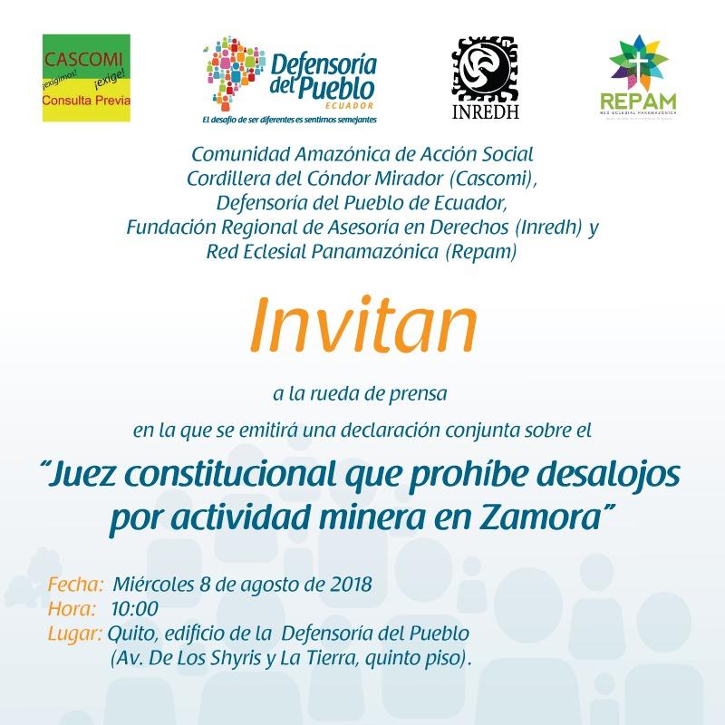 La Defensoría del Pueblo de Ecuador, la Comunidad Amazónica de Acción Social Cordillera del Cóndor Mirador (Cascomi), la Fundación Regional de Asesoría en Derechos (Inredh) y la Red Eclesial Panamazónica (Repam) invitan a la rueda de prensa en la que se emitirá una declaración conjunta sobre el “Juez constitucional que prohíbe desalojos por actividad minera […]