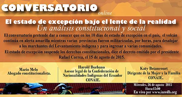 Comunicación INREDH 25/08/2015 CONVERSATORIO «El estado de excepción bajo el lente de la realidad: un análisis constitucional y social» Con la declaración del estado de excepción, decreto número 755, a nivel nacional por la actividad del volcán Cotopaxi, quedó el gobierno facultado para desplegar militares en apoyo a labores de socorro y seguridad.