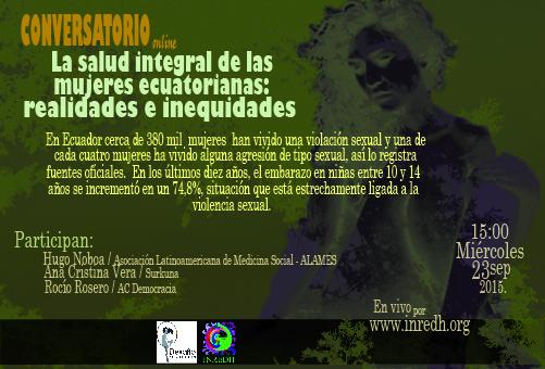 Comunicación INREDH 24/11/2015 Conversatorio: Mujeres: violencia, políticas públicas y reivindicación en Ecuador y América Latina En el marco del Día Internacional de la eliminación de la Violencia contra la Mujer, 25 de noviembre, analizaremos la situación de la violencia pública y privada de la cual es víctima la mujer ecuatoriana y latinoamericana. Además, […]