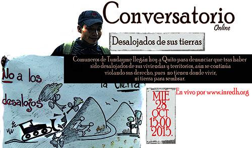 Comunicación INREDH 08/10/2015 Conversatorio «Desalojados de sus tierras» Como es de su conocimiento el pasado el 30 de septiembre de 2015, en San Marcos de la Parroquia Tundayme, cantón El Pangui, en Zamora Chinchipe, se desalojaron a 13 familias por parte de miembros de la empresa minera china ECUACORRIENTE y por 135 miembros de […]
