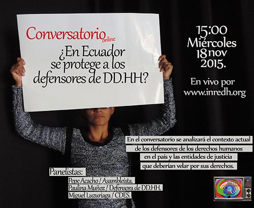 Comunicación INREDH 17/11/2015 ¿En Ecuador se protege a los defensores de DD.HH? Una defensora o un defensor de derechos humanos es la persona que promueve y defiende cualquier derecho humano reconocido por las normas nacionales o internacionales, así como los nuevos derechos, como el de la naturaleza, o aquellos que todavía se están […]