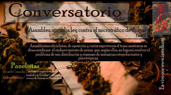 Comunicación INREDH 06/10/2015 Conversatorio «Asamblea aprueba ley contra el microtráfico de drogas» Cuestionamientos y desacuerdos generó el proyecto de Ley de Prevención Integral de Drogas aprobado en segundo debate por el Pleno de la Asamblea Nacional el pasado jueves, 1 de octubre de 2015.
