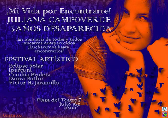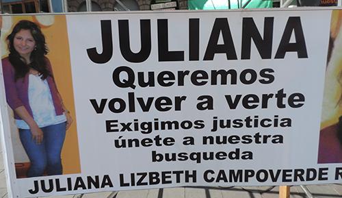 Comunicación INREHD 20/07/2015 Los desaparecidos fueron visibilizados en la Plaza del Teatro ¡Lucharemos hasta encontrarlos! fue el lema para recordar los 3 años de la desaparición de Juliana Campoverde, que fue vista por última vez el 7 de julio de 2012, en el sur de Quito.