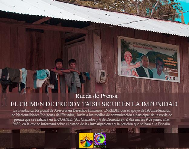 Comunicación INREDH 05/06/2015 Rueda de prensa “Crimen de Freddy Taish sigue en la impunidad” La Fundación Regional de Asesoría en Derechos Humanos (Inredh) y los familiares de Freddy Taish con el apoyo de la Confederación de Nacionalidades Indígenas del Ecuador (Conaie) invitan a los medios de comunicación a participar de la rueda de […]