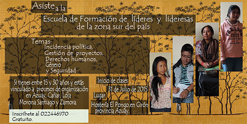 Comunicación INREDH 29/07/2015 Escuela de formación zona sur del país Este 31 de julio se inicia la Escuela de formación de líderes y lideresas de la zona sur del país, en la Hostería El Pongo, en Girón, provincia Azuay. Alrededor de 50 personas de cinco provincias iniciarán este proceso.