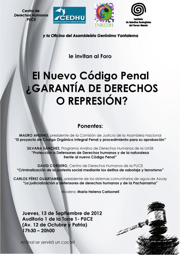 Comunicación INREDH 10/09/2012 Nuevo Código Penal ¿Garantía de Derechos o Represión? Organizan: CEDHU, INREDH, Intstituto de Estudios Ecologistas del Terecer Mundo y Oficina del Asambleísta Gerónimo Yantalema Ponentes: MAURO ANDINO, presidente de la Comisión de Justicia de la Asamblea Nacional. «El proyecto de Código Orgánico Integral Penal y procedimiento para su aprobación»