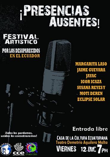 ASFADEC 09/12/2014 Festival artístico «Ausencias presentes» La Asociación de Familiares y Amigos de Personas Desaparecidas en Ecuador (Asfadec) y un grupo de artistas invitamos al Festival artístico “Ausencias Presentes” que se realizará este viernes 12 de diciembre, a las 19 horas, en la Sala Demetrio Aguilera Malta, Casa de la Cultura Ecuatoriana (calles Av. 6 de diciembre […]