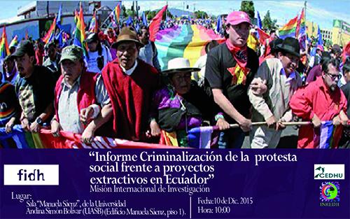 Fidh, Cedhu e Inredh 08/12/2015 Rueda de Prensa “Criminalización de la protesta social frente a proyectos extractivistas en Ecuador” La Federación Internacional de Derechos Humanos (FIDH) invita a los medios de comunicación a la presentación del informe “Criminalización de la protesta social frente a proyectos extractivistas en Ecuador, 2015”, que se realizará el jueves, 10 […]