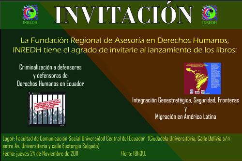 Comunicación INREDH 15/11/2011 Invitación lanzamiento libros La Fundación Regional de Asesoría en Derechos Humanos, INREDH, tiene el honor a invitarle al lanzamiento de los libros: “Criminalización de los Defensores y Defensoras de Derechos Humanos en Ecuador” De: Dra. Mélida Pumalpa Iza Dr. Rodrigo Trujillo Orbe “Integración estratégica, seguridad, frontera y migración en América Latina” […]