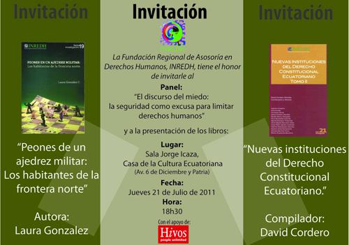 Comunicación Inredh 11/07/2011 Foro Discurso del miedo: la seguridad como excusa para limitar los DDHH La Fundación Regional de Asesoría en Derechos Humanos, INREDH, tiene el honor a invitarle a: Panel: El discurso del miedo: la seguridad como excusa para limitar derechos humanos” Y la presentación de los libros: “Peones de un […]
