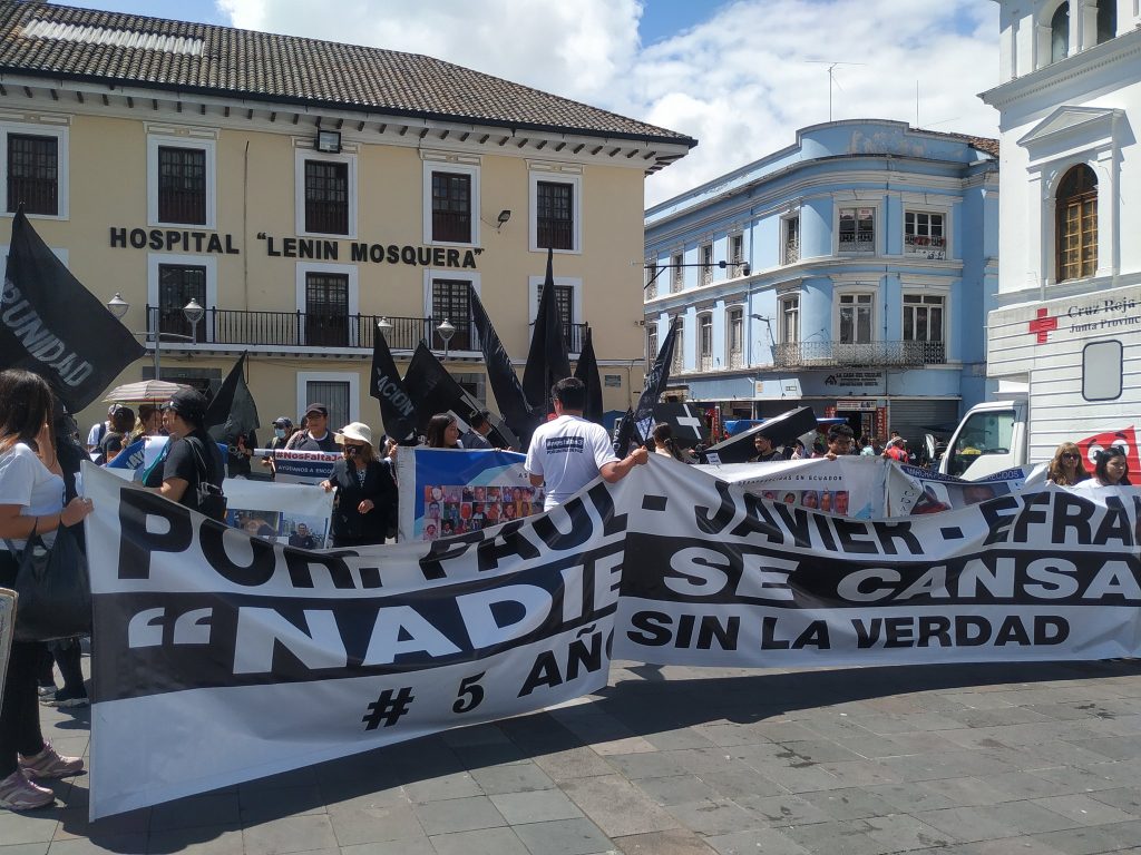 Con ataúdes negros con los nombres de las instituciones del Estado ecuatoriano, tales como Fiscalía, Dinased, Presidencia, entre otros; marcharon los integrantes de las organizaciones Nos faltan 3, Asfadec, Covidefem, Alexandra Córdova, Miroslava Cando y sus acompañantes, con el objetivo de visibilizar simbólicamente la muerte de la justicia y de la verdad. Este acto simbólico […]