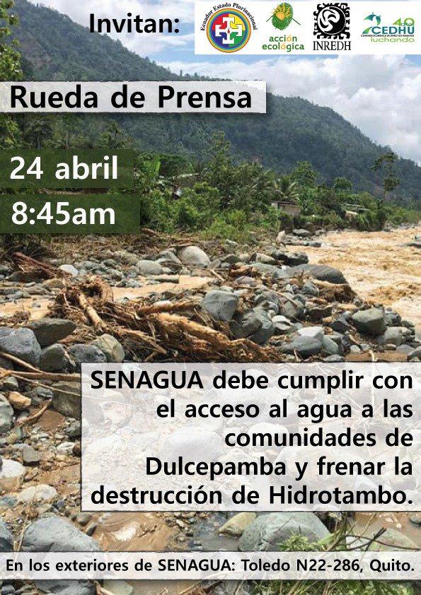 El día miércoles, 24 de abril de 2019 a las 8:30 AM en la Secretaría del Agua de Quito, el Secretario del Agua Humberto Cholango Tipanluisa recibirá a cerca de 100 personas representantes de las 140 comunidades de la cuenca del Río Dulcepamba, provincia de Bolívar, quienes reclaman su derecho al agua y a la integridad física los habitantes de la comunidad San Pablo de Amali, afectados gravemente hace más de 15 años por el proyecto hidroeléctrico San José del Tambo de la compañía privada Hidrotambo S.A.
