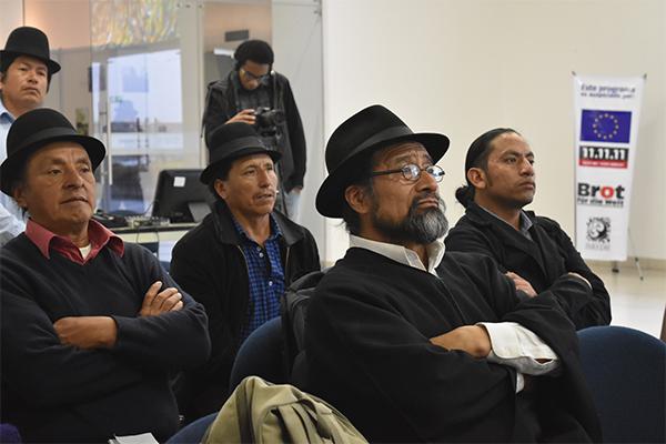 Manuel Castillo, dirigente de Fortalecimiento de la Coonaie; Jaime Vargas, presidente de la Conaie, y Luis Ángel Saavedra