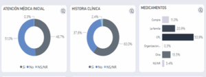 En cuanto al eje de salud, se observa que el 51% de los y las ppl no cuentan con una atención médica inicial a su llegada al centro de rehabilitación social. Además, 37.6 % no cuentan con histórica clínica. En cuanto a medicamentos, solo la mitad de la población carcelaria recibe sus medicamentos por parte del propio dentro de privación de la libertad. Los demás deben adquirir sus medicamentos a través de tu familia o de otras formas.