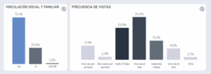 En otros ejes de atención, se observa que 73.1% no acuden al servicio de trabajo social y familiar. De esto se desprende que la frecuencia con que familiares y amigos visitan a los ppl, la mayoría solo recibe visitas una vez al mes lo cual podría traducirse en cierto abandono por parte de sus familiares. Si Bien es cierto que esta información se basa en la percepción de las personas privadas de libertad -variable que es subjetiva- no se deben subestimar estos datos ya que nos puede brindar un panorama más amplio de la situación carcelaria en general desde la perspectiva de los propios usuarios y no solo desde la visión externa.