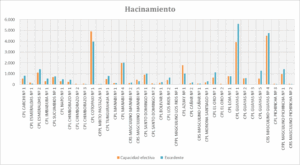 En el gráfico de barras se realiza una comparación entre la capacidad efectiva que tienen los centros de rehabilitación y el excedente en su capacidad. Se observa que, en la gran mayoría de los centros de privación, su capacidad ha sido excedida con creces, mientras que en unas pocas aún tienen espacio para albergar a más personas. Resalta que 7 de las 11 cárceles de más alto riesgo presentan hacinamiento del 139% lo cual no solo va en contra de los derechos humanos de las personas privadas de libertad, sino que también ocasiona que sea mucho más complicado mantener el control sobre estos centros desembocando en la gran crisis carcelaria que estamos viviendo.