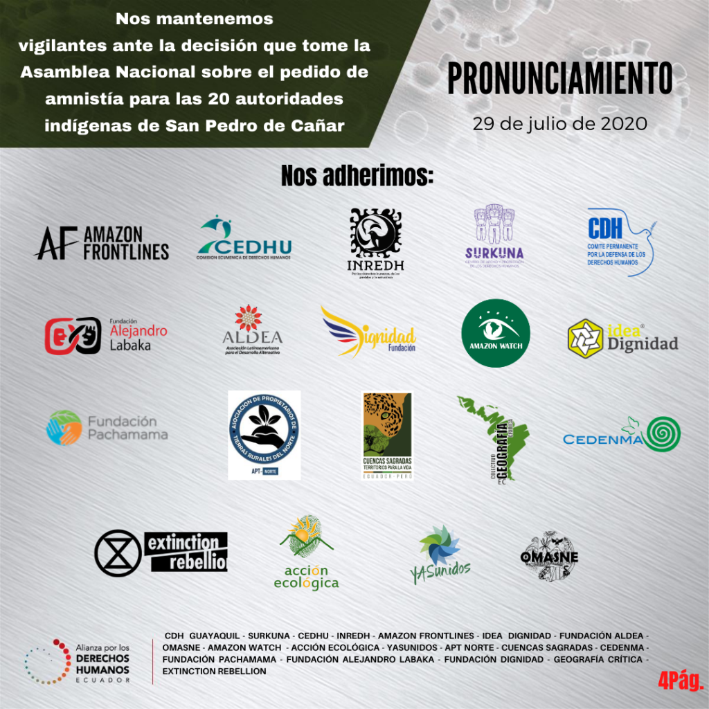 Nos mantenemos vigilantes ante la decisión que tome la Asamblea Nacional sobre el pedido de amnistía para las 20 autoridades indígenas de San Pedro de Cañar