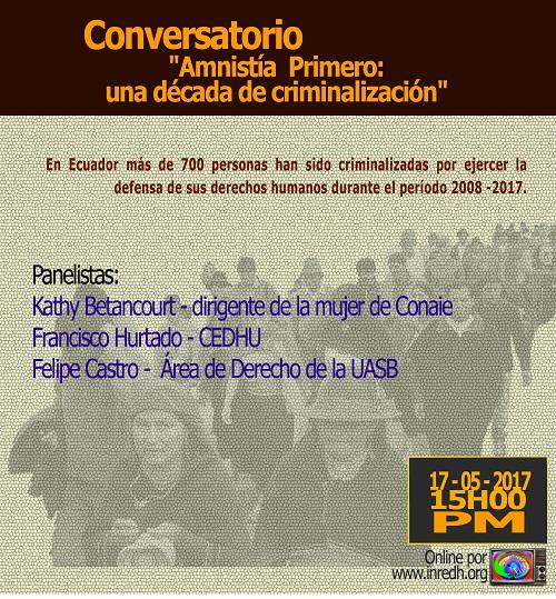 Comunicación Inredh 11/05/2017 Conversatorio «Amnistía Primero: una década de criminalización» Más de 700 personas en Ecuador han sido criminalizados por ejercer su derecho a la resistencia, a la organización o por defender los derechos humanos intrínsecos de cada ser. Este miércoles, 17 de mayo de 2017, a las 15:00, analizaremos el contexto de […]