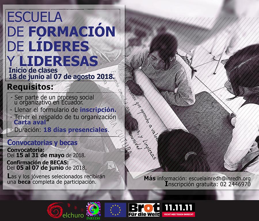 La Fundación Regional de Asesoría en Derechos Humanos (Inredh) y Fundación El Churo invitan a las y los jóvenes a inscribirse en la Escuela de formación de líderes y lideresas del Ecuador que se desarrollará del 14 de junio hasta el 7 de agosto de 2018.