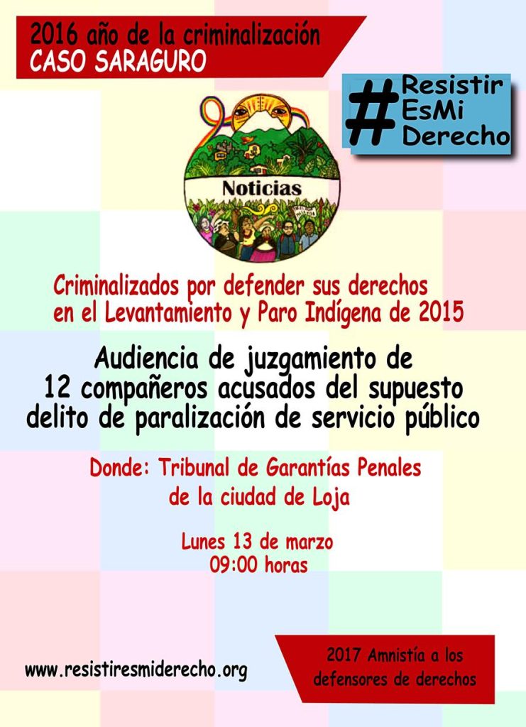 Comunicación INREDH 13/03/2017 Audiencia de juzgamiento para los 12 procesados Saraguro Este lunes 13 de marzo el Tribunal de Garantías Penales de Loja instalará la audiencia por Paralización de servicio público (Art. 346), a las 9 de la mañana. Recordemos que nuestros compañeros Saraguros fueron víctimas del estado de excepción, este caso dejó […]